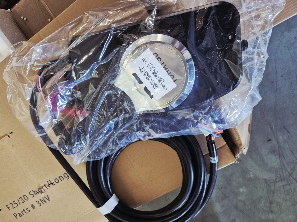 Yhä laatikossaan oleva moottori sähköstartilla, kaukohallintalaitteella ja tiltillä. Raikkaan valkoinen. Pitkä riki. Yhä takuurekisteröimätön, joten 7 vuoden takuu on kokonaan jäljellä.