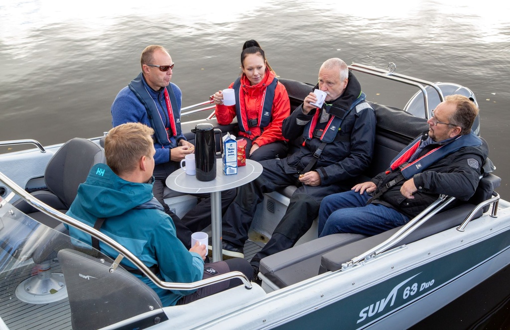 Nyhet 2022! Suvi 63 Duo är en rymlig och välutrustad stug- och förbindelsebåt som lämpar sig för skärgården och stora sjöar. Bak- och sidobänkar bildar en u-formad soffa, som med sina nya ryggstöd passar bra för kaffepauser. Som tilläggsutrustning finns exempelvis ett större bord att få. Under sidobänkarna finns låsbara stuvutrymmen.